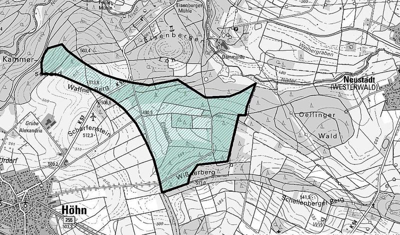 Der räumliche Geltungsbereich des Aufhebungsplanes befindet sich nordöstlich der Ortslage von Höhn in den Gemarkungsbereichen »Kammerscheid, Waffner Berg, Eisenberger Loh, Wißnerberg« und wird in dem beigefügten Lageplan mit einer durchgezogenen schwarzen Linie dargestellt.